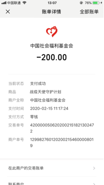 同班同学徐哲,2月15日网上捐赠200元。他们表示尽管不能奔赴一线,但是他们希望能为抗击疫情尽自己的微薄之力。老员工应当有家国情怀,在这场没有硝烟的战场上公司员工勇于贡献出自己的力量,用力所能及的方式加油武汉,加油中国!
