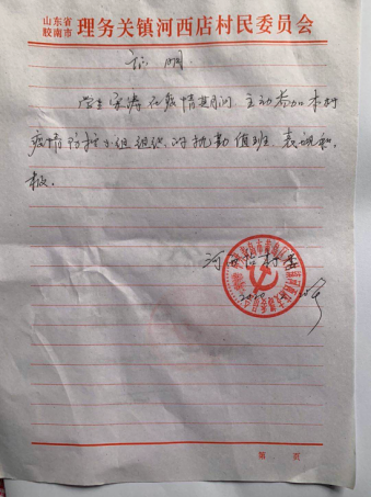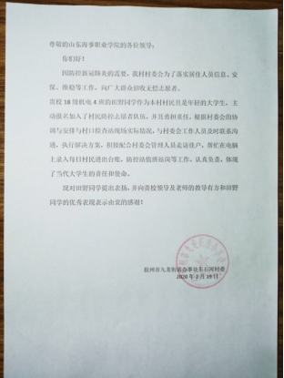 18级机电4班田野同学家住山东省胶州市九龙街道办事处东石河村,疫情期间主动报名加入了村民防控志愿者队伍,并且勇担重任,根据村委会的协调和安排,与村委会工作人员及时联系沟通执行解决方案,积极配合村委会管理人员走访住户,他还需每日在电脑上录入村民进出台账,同时做好防控站值班站岗的工作。