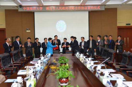 2015年4月23日,潍坊市政府与中国海洋大学签署市校战略合作协议。市委书记杜昌文、中国海洋大学党委书记孙也刚出席签约仪式并致辞,副市长王桂英与中国海洋大学副董事长李巍然代表双方签约;市委常委、秘书长孙明亮,中国海洋大学党委常务副书记张静、永利集团304am官方入口经理王敬良等出席签约仪式。